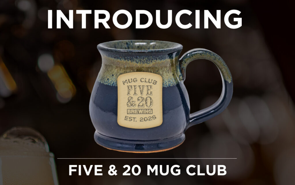 – Receive a uniquely crafted “Five & 20 Mug Club” 16 oz ceramic mug* (to stay at our taproom and for you to take home at the end of the membership year)